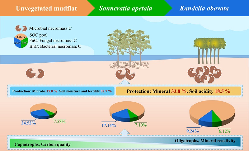 近日,中国科学院南海海洋研究所研究员王友绍和程皓团队在红树林“蓝碳”碳储存机制方面取得重要进展。研究人员选取了湛江附城由Kandelia obovata、Sonneratia apetala及无植被泥滩组成的红树林恢复区开展研究,发现红树林造林后细菌、真菌残体碳以及微生物总残体碳均显著增加,其中K. obovata人工林表现明显。研究发现,红树林造林增加了细菌和真菌丰度,提高了微生物活体生物量和微生物残体碳的生产。同时,微生物残体碳的积累与无定形氧化铁呈正相关,矿物保护对红树林造林后微生物残体碳积累贡献更显著,且细菌和真菌中K类群比例增加被认为是导致土壤碳库中微生物残体碳比例降低的重要因素。