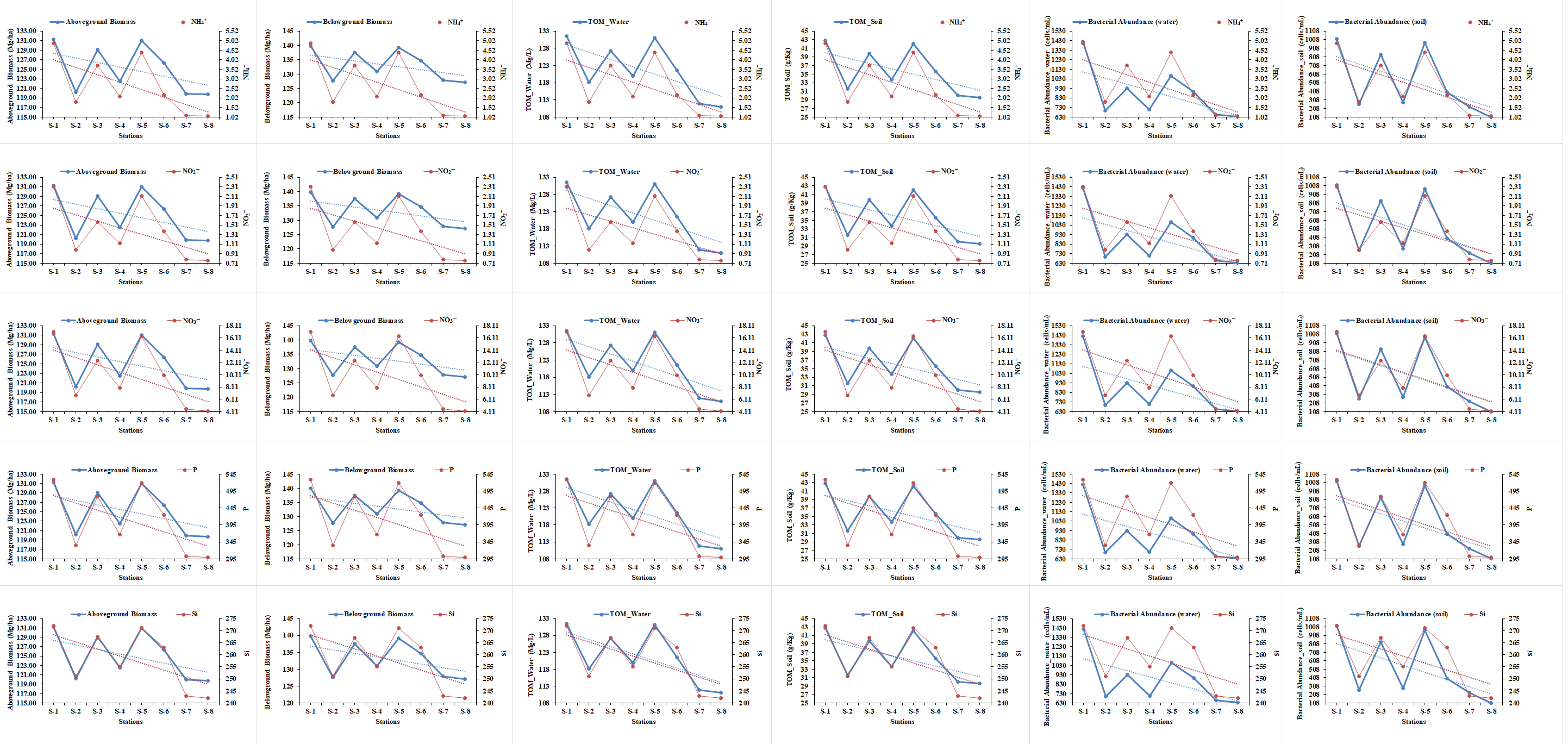 营养物质与红树林生物量、总有机物(TOM)和细菌丰度的比较