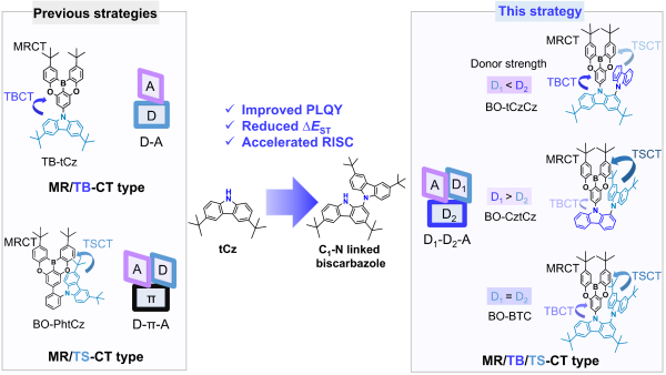 中国科学院福建物质结构研究所研究员卢灿忠课题组提出并阐述了多通道电荷转移(MPCT)激发态的构筑与调控策略,开发出一类基于可调控MPCT激发态的深蓝光热活化延迟荧光(TADF)材料。
