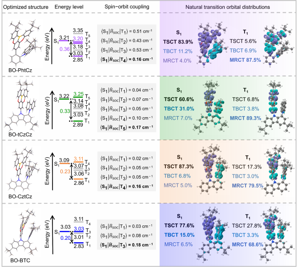 基于BO-BTC的蓝光OLED,无论是作为发光客体还是敏化剂,器件效率和色纯度在同类器件中均表现突出,展现出应用潜力。研究结果表明,通过合理设计D1-D2-A型分子结构来构建和调控MPCT激发态,能够有效解决深蓝光TADF材料设计中发光效率、色纯度和反向系间窜越速率难以平衡的关键问题。这种分子设计策略允许给受体在类型和数量上的多样化组合,为开发超高清显示所需的高性能深蓝光材料提供了新的研究思路。
