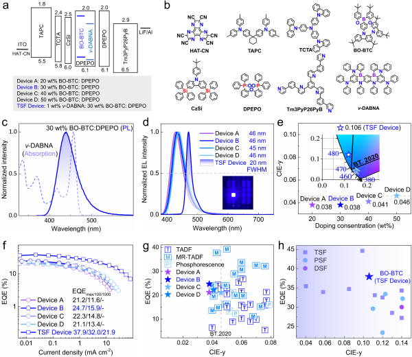 除了发光性能,该类材料还表现出优异的热稳定性。分子BO-BTC热分解温度达414 °C,玻璃化转变温度高达194 °C。以BO-BTC作为客体发光材料,实现了满足BT.2020标准的高效深蓝光OLED,器件最大外量子效率(EQEmax)为24.7%,色坐标为(0.156,0.038),蓝光指数超过232 cd A −1。值得注意的是,在20-50 wt%的宽掺杂范围内器件EQEmax均大于21%,展现出很小的浓度淬灭。同时,由于具有较高的反向系间窜越速率,BO-BTC还可以作为敏化剂使用,以BO-BTC作为窄谱带蓝光客体v-DABNA的敏化剂所制备的敏化蓝光器件EQEmax达37.9%,色坐标为(0.118,0.106),蓝光指数高达308 cd A −1。