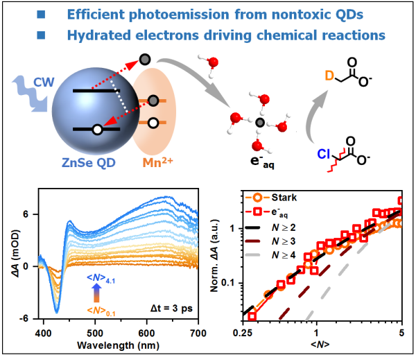 近日,中国科学院大连化学物理研究所研究员吴凯丰团队在量子点超快光物理与光化学研究方面取得进展,开发了锰掺杂的硒化锌(ZnSe)量子点,用于驱动水合电子的高效生成,并将其应用于有机光催化反应中。