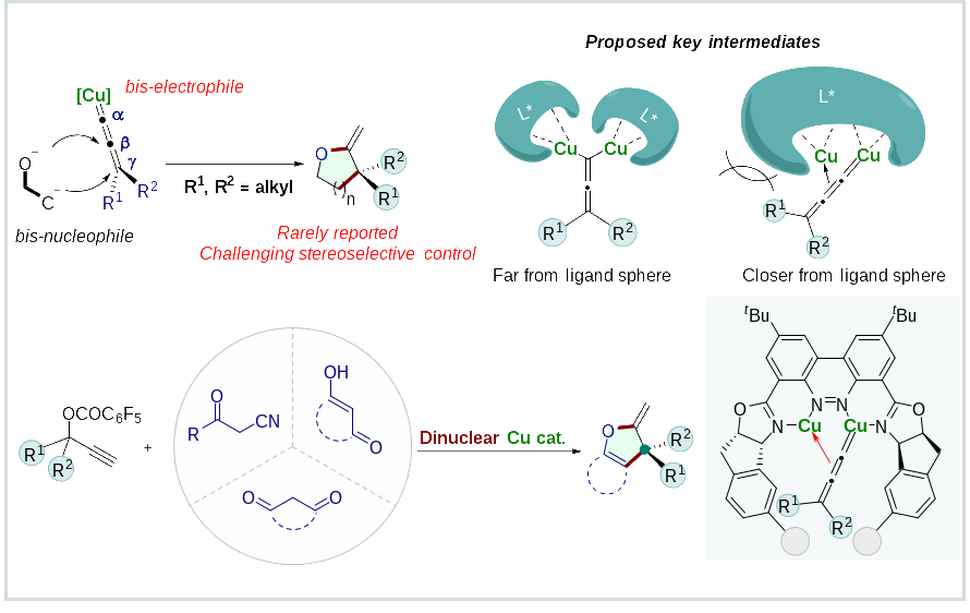 相关研究成果以Enantioselective construction of cyclic quaternary stereocenters via dinuclear copper catalyzed asymmetric [3 + 2] propargylation/annulation为题,发表在《自然-通讯》(Nature Communications)上。