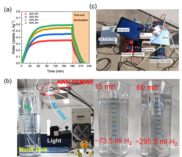 (a)吸附剂在不同相对湿度下的空气集水性能;(b)室内模拟太阳光驱动实验;(c)野外观测实验