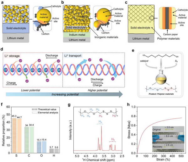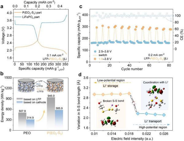 在前期对富硫聚合物电极材料和聚合物固态电解质的研究基础上,团队利用聚合物分子的设计灵活性和界面适应性,在主链上共价引入具有离子传导功能的乙氧基团和氧化还原活性的短硫链,制备出兼具高离子传输能力(离子电导率达1.0 × 10-4 S cm-1,50 °C)与高离子储存功能(放电比容量达491.7 mAh g-1)的分子尺度界面一体化聚合物材料P(EO2-S3)。实验与理论计算显示,P(EO2-S3)的电子结构可随电位发生可逆转变,实现在不同电位区间离子传输与存储行为的可控切换,拓展了其在固态电池中的多样化应用场景。基于P(EO2-S3)构建的一体化柔性电池具有高达20,000次的抗弯折性能和快速反应动力学。研究发现,将P(EO2-S3)作为常规正极聚合物电解质时,其氧化还原活性可在特定电位下被激活,从而将正极的能量密度提升86%。