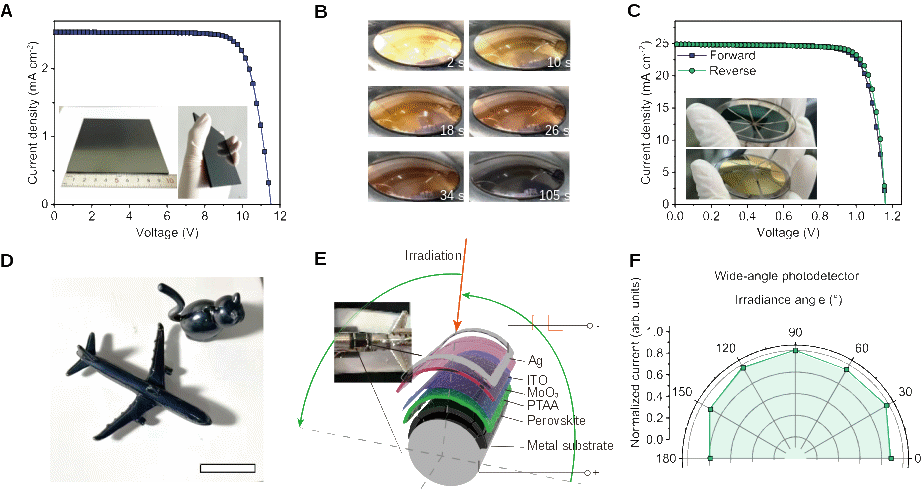 此外,研究突破了传统平面制备的限制,在具有高斯曲率的刚性曲面上实现了无旋涂的高效钙钛矿器件制备,曲面太阳能电池效率超过23.2%。该喷涂策略还支持从纳米到微米尺度的膜厚连续调控,并可直接应用于复杂三维结构和图案化沉积。