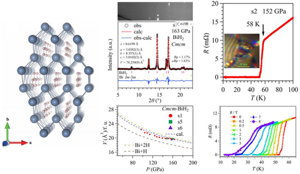 团队通过同步辐射X射线衍射并结合CALYPSO晶体结构搜索技术,确定上述化合物为具有Cmcm空间群的BiH2,其结构呈现“Bi原子开放通道”主体框架,通道内填充类H2分子单元,是新型的“主—客”结构的分子型金属氢化物。原位高压下的变温电阻测量表明,BiH2在约163 GPa下的Tc达到62 K,这是首次在MH2类型的金属二氢化物体系中发现超导电性。理论计算表明,与典型的共价或笼型氢化物不同,BiH2在费米面附近的电子态密度由Bi-6p电子主导,其高温超导电性主要源自Bi原子低频振动贡献的电—声耦合λ和类H2分子单元的中频振动贡献的较高的对数平均声子频率ωlog,二者协同使得在较低氢含量的BiH2中实现了高Tc。