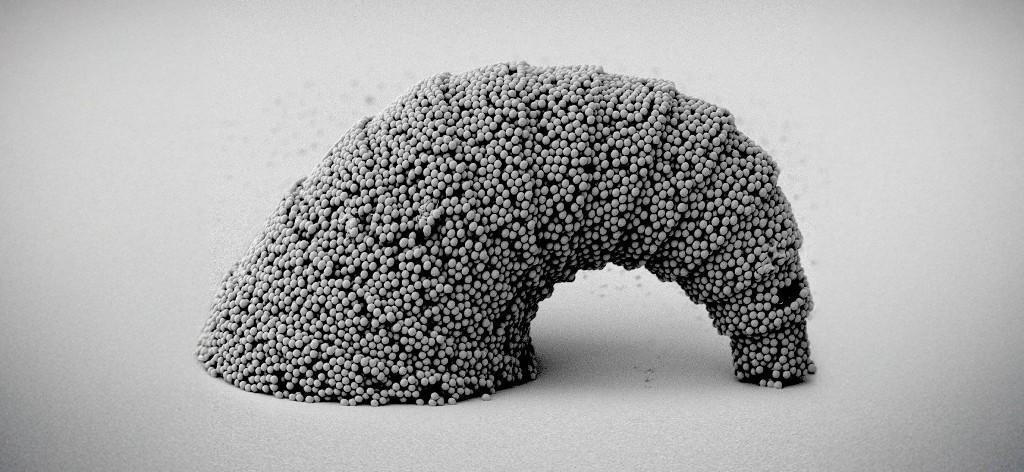 这种微模具如同一个微型“蛋糕模”,侧面设有小口。粒子随流而动,穿过缝隙,精准落入模腔,层层堆积成所需形状。模具可设计为立方体、球体,甚至牛角面包等复杂曲面结构,自由度极高。组装完成后,通过后处理去除聚合物模具,便留下一个完全由目标材料构成的独立微结构。