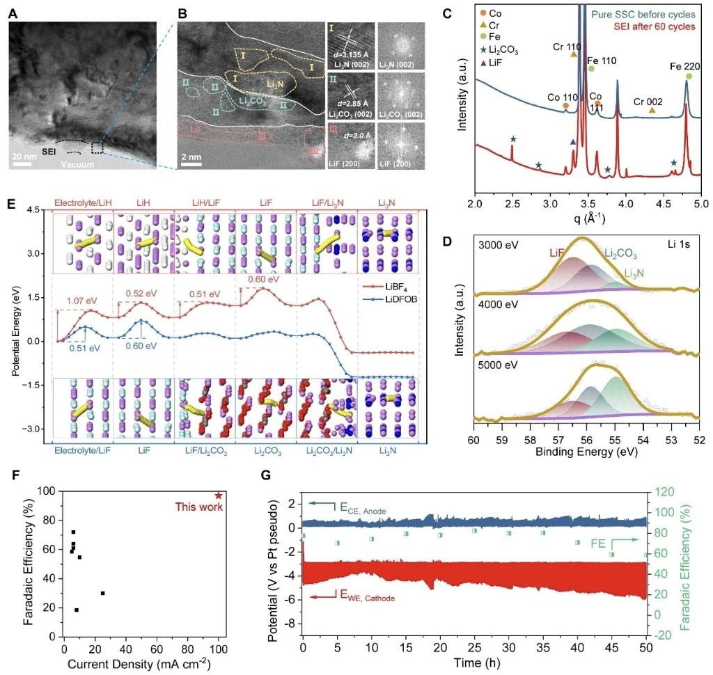 针对这一瓶颈,团队创新性构建功能分层SEI结构(DDLA),实现锂离子传输效率提升两个数量级。该多层级界面由LiF外层、Li₂CO₃离子传导层与Li₃N界面层精准组成,大幅降低锂离子去溶剂化与迁移能垒,显著抑制析氢副反应,从原理上突破高电流密度下的界面稳定性难题。