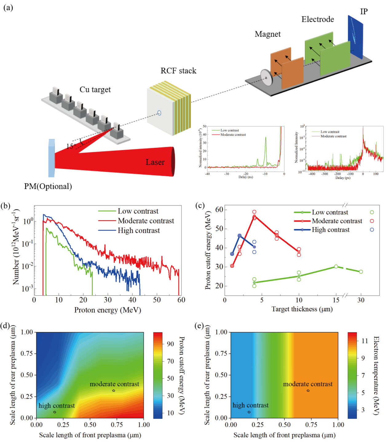 (a) 实验布置示意图,插图是激光的纳秒和皮秒对比度;(b)—(c) 不同对比度激光加速质子结果;(d)—(e) 质子截止能量和电子温度随靶前和靶后预等离子体标长变化的模拟结果