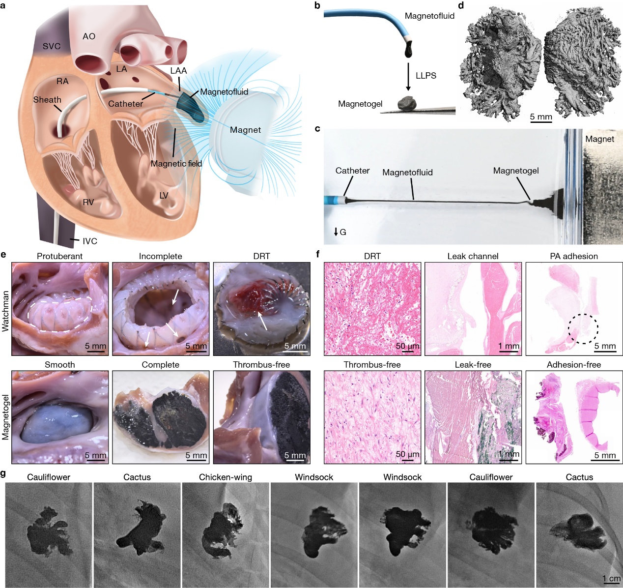 新型磁流体机器人可经心脏介入导管进入左心耳,在磁力牵引下,能成功对抗高速血流和剧烈心跳带来的干扰。与血液接触后,它能快速原位固化,继而形成完全贴合左心耳形状的磁凝胶,对出血部位完全封堵。
